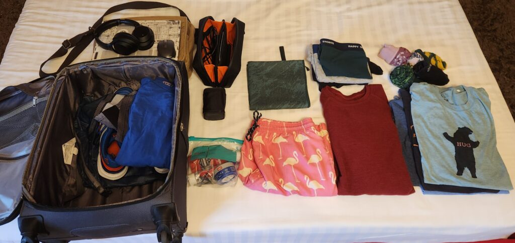 Und wie immer gilt: Was Platz sparen soll, ziehe ich an. Bequeme Schuhe, eine Trainingshose mit Reissverschlusstaschen (ich mag das sichere Gefühl, dass nichts rausfällt), T-Shirt, Hoodie mit Reissverschluss, Jacke. Minimaler Aufwand, maximale Ruhe.