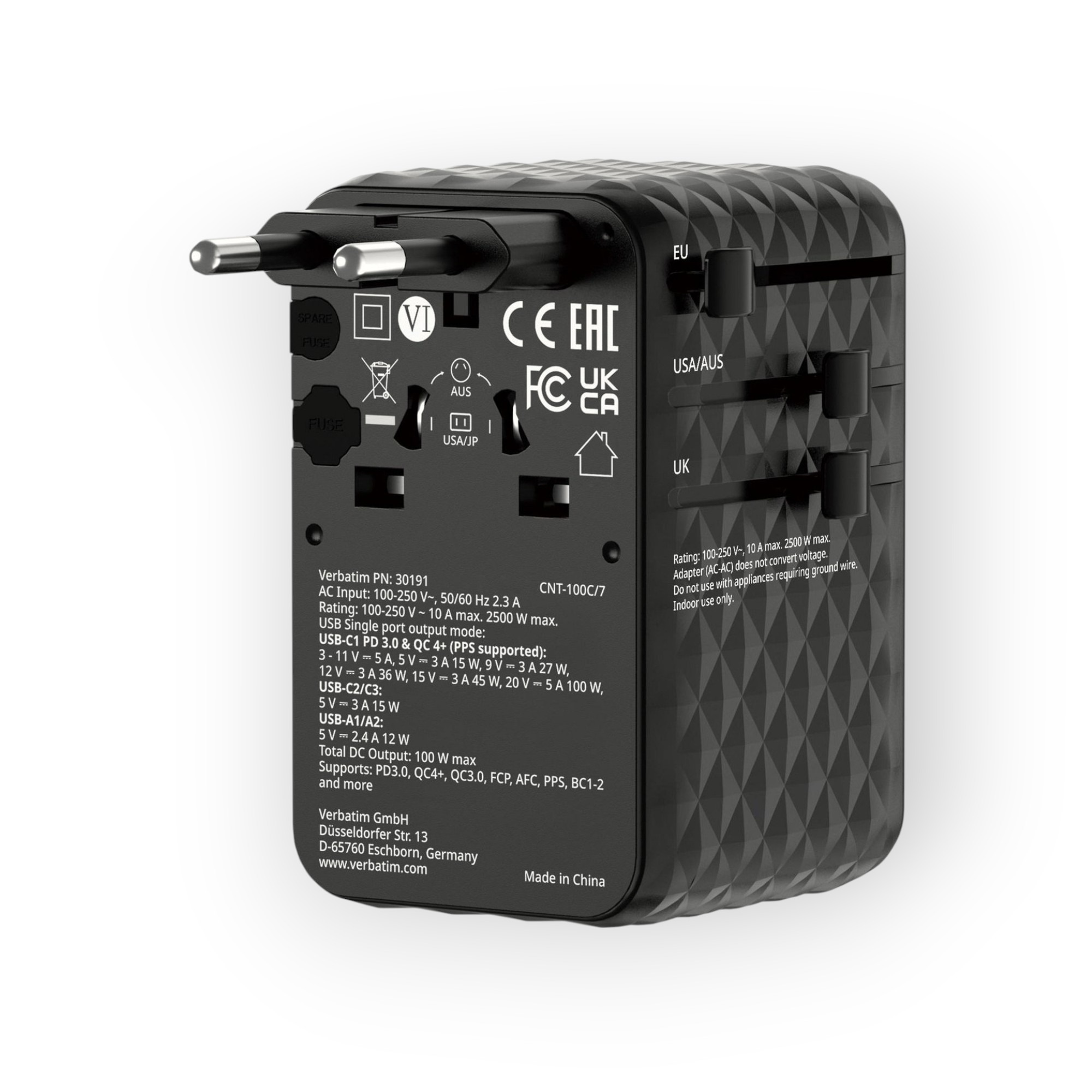 Dieser Reise Adapter in seinem eleganten, schwarzen 3D-Diamant-Gehäuse ist nicht nur leistungsstark, sondern auch ein echter Hingucker. Sein hochwertiges, feuerfestes Polycarbonat-Gehäuse sorgt für Sicherheit auf Reisen, und seine CE-, UKCA-, FCC- und ROHS-Zertifizierungen belegen, dass er strenge Standards erfüllt. Eine BS1362-konforme 10-A-Sicherung schützt Ihre Geräte – eine Ersatzsicherung ist im Lieferumfang enthalten. Dank der praktischen Reisetasche ist er für die Anforderungen weltweiter Reisen konzipiert, ohne dabei auf Eleganz oder Sicherheit zu verzichten.